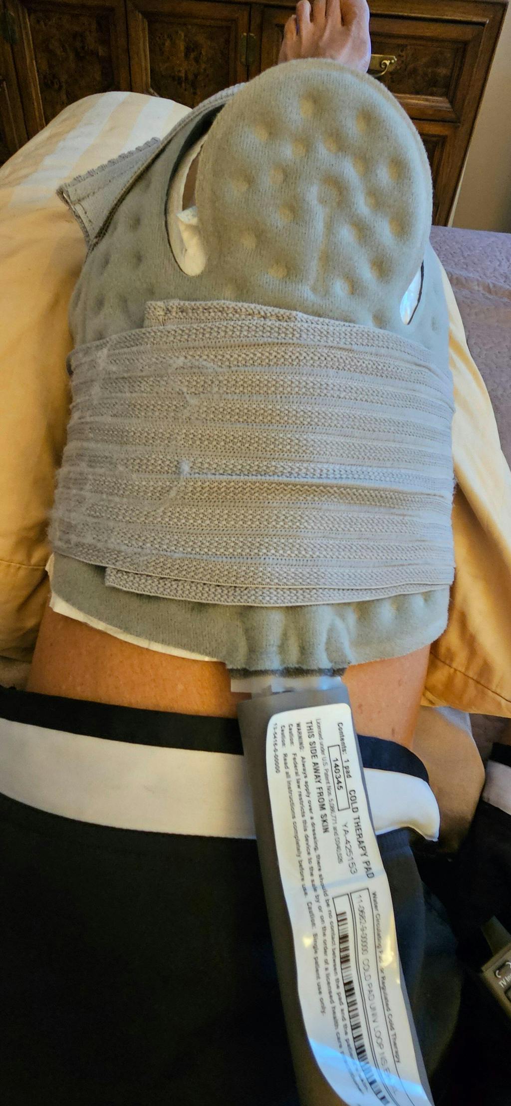 The hip attachment I ordered connected up great with the Donjoy Iceman cold machine I borrowed from my sister-in-law (I had been concerned it wouldn’t). Works fine, and the multiple freezer bags for ice also make it easy to set up. Yay.